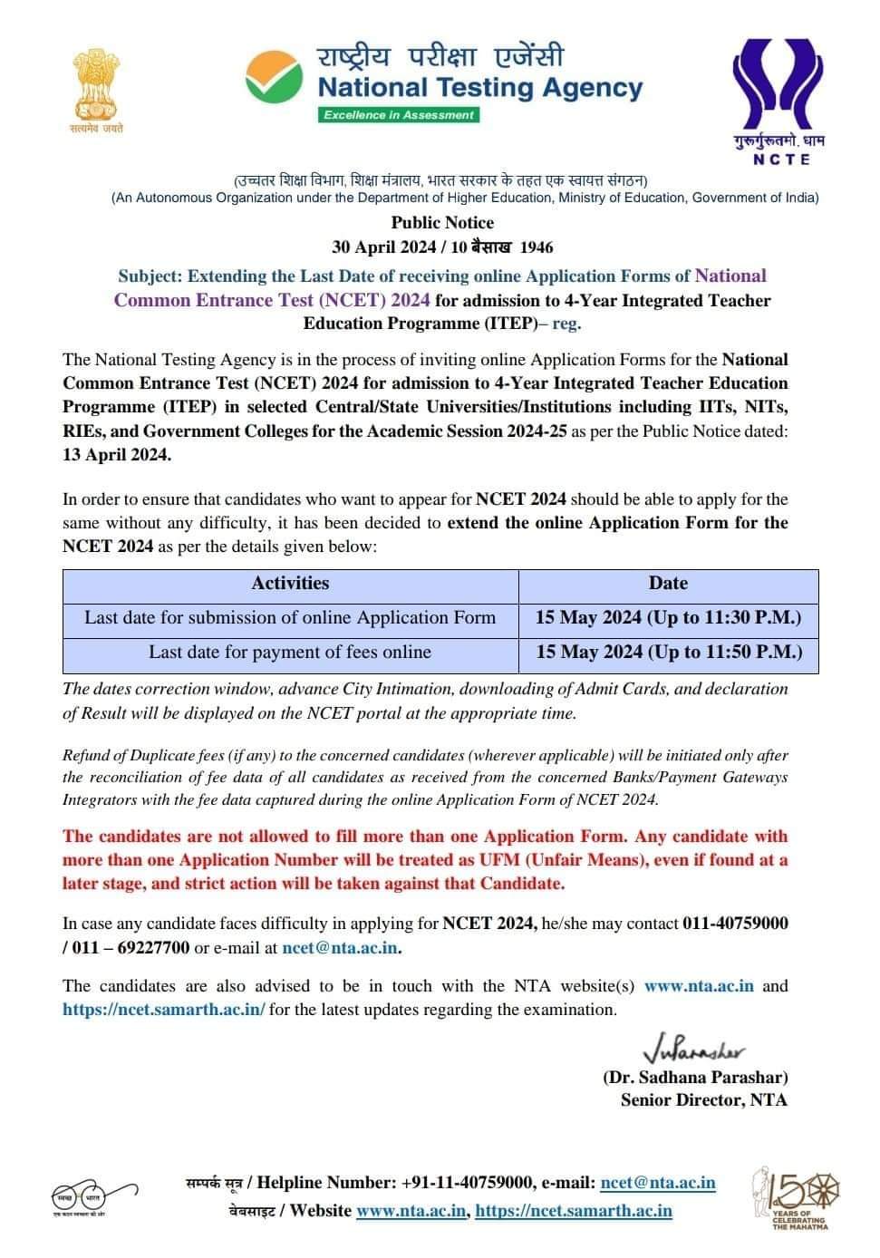 | 15 | Extension of Last Date of Online Application Submission, NCET 2024 | 2024-05-01 | View File | |